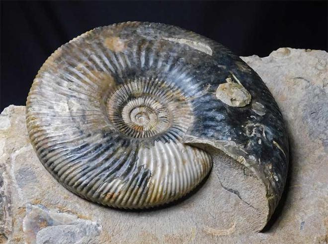 | This stunning black shelled Parkinsonia is approximately 167 million years old and makes a unique and magnificent display piece for either the discerning collector or an interior designer looking to achieve that extra something around the home or office space. High quality large specimens such as this one are very rare to find thesedays from this world famous oolithic locality. There are also a small cluster of Bivalves (Sphaeroidothyris Sphaeroidalis) and the tip of a belemnite preserved, which adds to the overall aesthetics. The matrix has a flat base and attached is an anti slip and scratch pad for peace of mind when displaying on fragile surfaces. Many hours of preparation has gone into this magnificent fossil by Andy Cowap and te finder was David Sole circa 2010. Fossils Direct is a premium collectors website. |