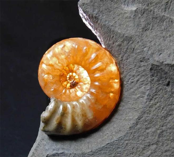 | This lovely ammonite has been preserved in yellow transluscent calcite and has been prepared both sides to allow light to pass through. The matrix has a level base for upright display. Approximately 200 million years old. Fossils Direct is a premium collectors website. |