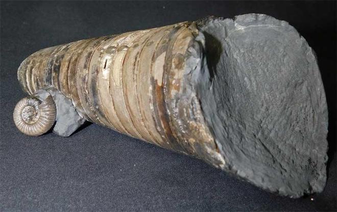| This is a wonderful association piece which consists of a small Dactylioceras (20mm) which has been washed up against a giant belemnite phragmacone. The detail throughout this specimen and the colouration is exquisite. One for the collector of fine fossils. Fossils Direct is a premium collectors website. |