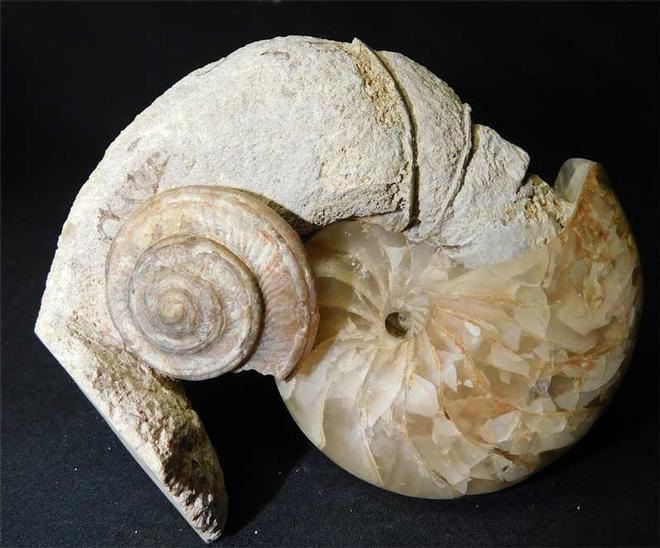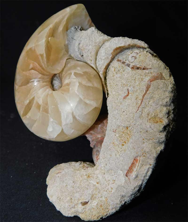 | A great amount of painstaking work, using traditional techniques, has gone into this stunning nautilus. No iron powder used. The nautilus has been preserved in a pale yellow transluscent calcite and it has been prepared both sides, so light passes through and the nautilus glows and all its internal chambers are visible. A marvellous and unique fossil prepared by Andy Cowap. On the reverse side is a large Gastropod specimen )Obornella granulata), which is a real aesthetic bonus. Fossils of this class and calibre very rarely come on to the open market for sale. This specimen was discovered in 1990 and has remained unprepared until this day. The matrix has been sculptured, along with a flat base for upright display. Approximately 170 million years old. Fossils Direct is a premium collectors website. |