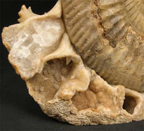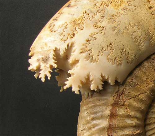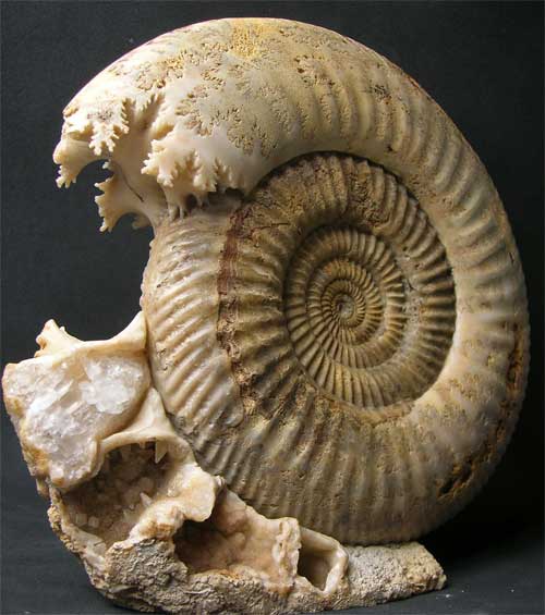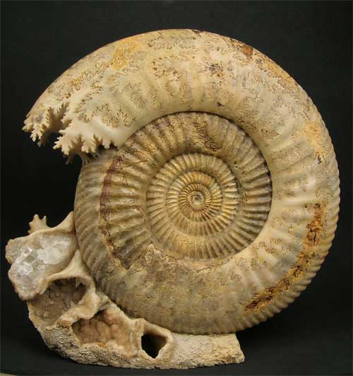 | This stunning piece of preparation was carried out by Andy Cowap. A complete section has been very carefully removed to reveal the complete suture line. Many, many hours of preparation has gone into this wonderful ammonite. Fossils from this world famous fossil locality are no longer accessible to the collector. World calss display fossils such as this one are highly prized by collectors and interior designers worldwide. The matrix at the base has been levelled for ease of display. Approximately 167 million years old. |