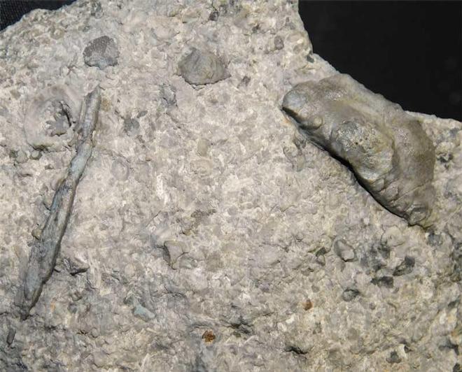 | A rare association to get a crushing tooth and a fin spine on the same piece of stone. The type of shark is a Ctenacanthus and was first described by "Agassiz 1835". The tooth especially has lovely patina and surface detail. This famous Carboniferous locality has been abandoned for over 60 years and is now heavily overgrown, any specimens are very difficult to collect and permission sought. One for the serious and discerning collector of extremely rare English Carboniferous shark material. Collected in 1959, this piece has resided in the late Professor GORDON WALKDEN collection. Approximately 345 million years old. |