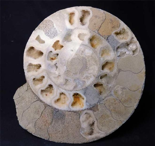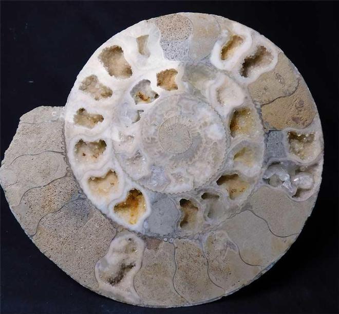 | A really nice example of a cut and highly polished half ammonite. The open chambers are packed with 'Dog tooth' and 'Nail head' calcite crystals. The ammonite has taken many hours to prepare like this. This specimen will look wonderful in any home or office setting, and is approximately 167 million years old. The ammonite comes with a wrought iron black stand for display purposes. Fossils Direct is a premium collectors website. |