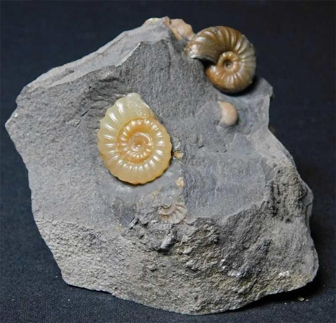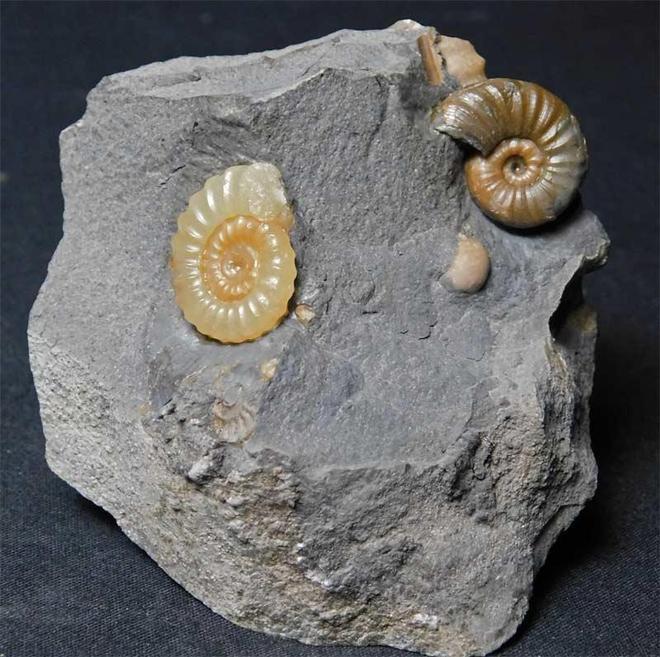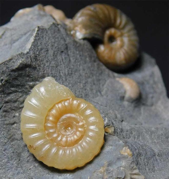 | This highly aesthetic double ammonite fossil is approximately 200 million years old and has been fully prepared. There is also a beautifully preserved pale yellow Promicroceras planicosta next to the Asteroceras. A very nice combination of ammonites for the collector. Fossils Direct is a premium collectors website. |