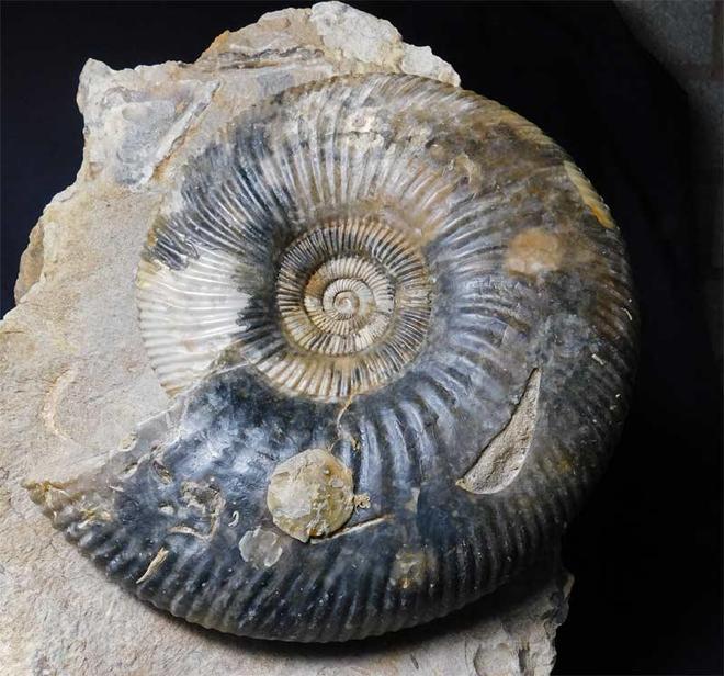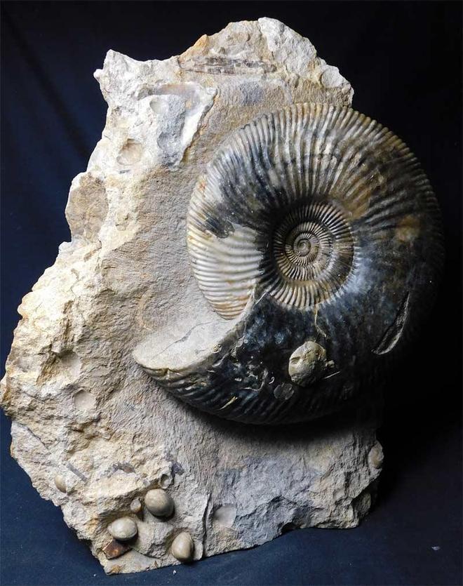 | This stunning black shelled Parkinsonia is approximately 167 million years old and makes a unique and magnificent display piece for either the discerning collector or an interior designer looking to achieve that extra something around the home or office space. High quality large specimens such as this one are very rare to find thesedays from this world famous oolithic locality. There are also a small cluster of Bivalves (Sphaeroidothyris Sphaeroidalis) and the tip of a belemnite preserved, which adds to the overall aesthetics. The matrix has a flat base and attached is an anti slip and scratch pad for peace of mind when displaying on fragile surfaces. Many hours of preparation has gone into this magnificent fossil by Andy Cowap and te finder was David Sole circa 2010. Fossils Direct is a premium collectors website. |