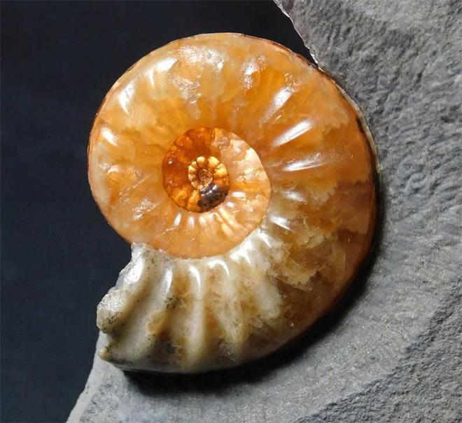 | This lovely ammonite has been preserved in yellow transluscent calcite and has been prepared both sides to allow light to pass through. The matrix has a level base for upright display. Approximately 200 million years old. Fossils Direct is a premium collectors website. |
