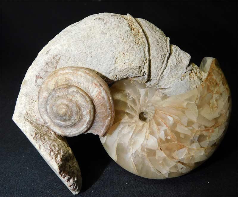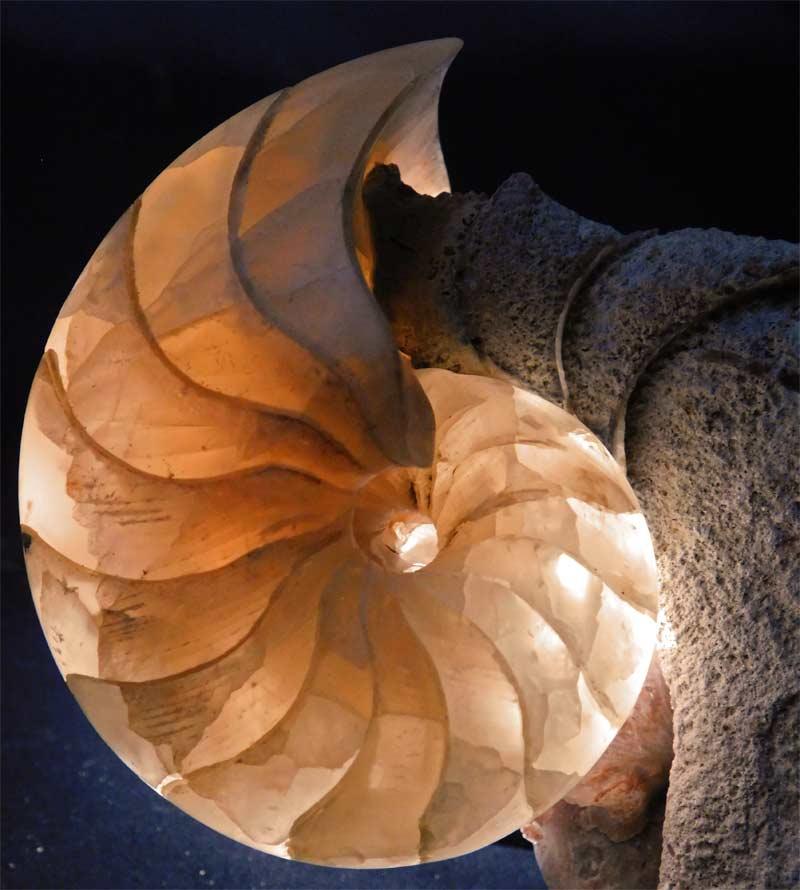 | A great amount of painstaking work, using traditional techniques, has gone into this stunning nautilus. No iron powder used. The nautilus has been preserved in a pale yellow transluscent calcite and it has been prepared both sides, so light passes through and the nautilus glows and all its internal chambers are visible. A marvellous and unique fossil prepared by Andy Cowap. On the reverse side is a large Gastropod specimen )Obornella granulata), which is a real aesthetic bonus. Fossils of this class and calibre very rarely come on to the open market for sale. This specimen was discovered in 1990 and has remained unprepared until this day. The matrix has been sculptured, along with a flat base for upright display. Approximately 170 million years old. Fossils Direct is a premium collectors website. |