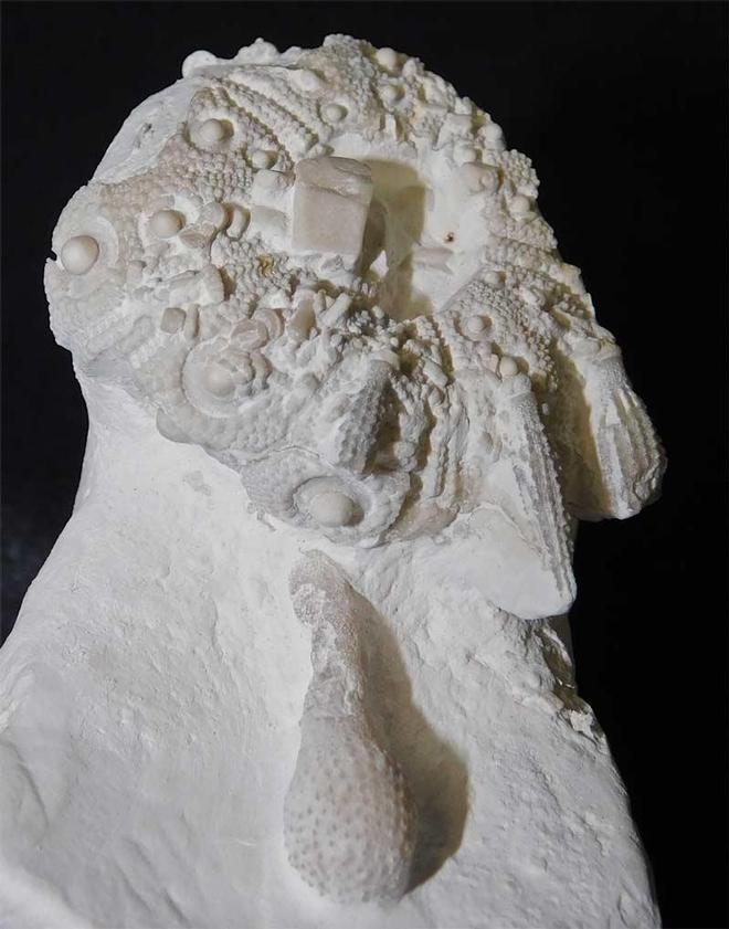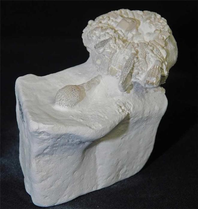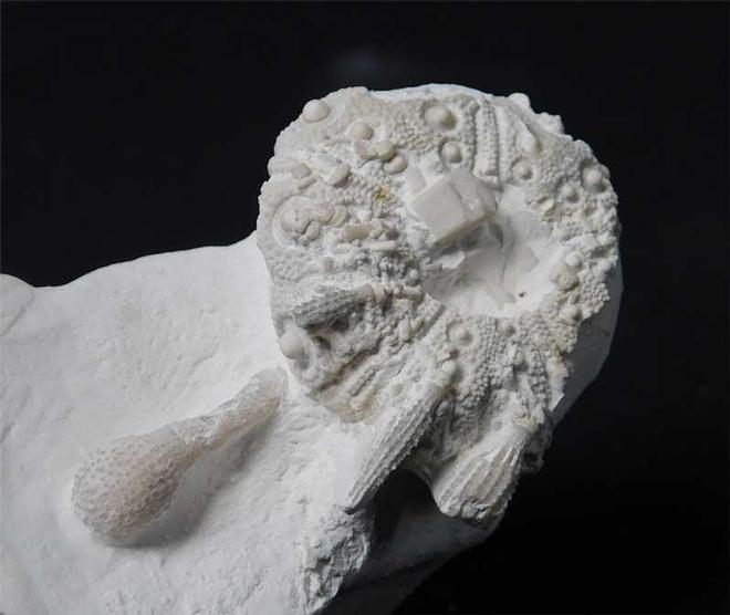 | This classic chalk echinoid is approximately 85 million years old and lies on a small block of chalk. This echinoid lived as an omniverous grazer on shells and sponges on the chalk sea floor. There are a few club spines still attached to the test which is a lovely and aesthetic feature. This specimen was discovered in 1989 and has resided in the late GORDON WALKDEN collection. Approximately 85 million years old. One for the discerning collector. |