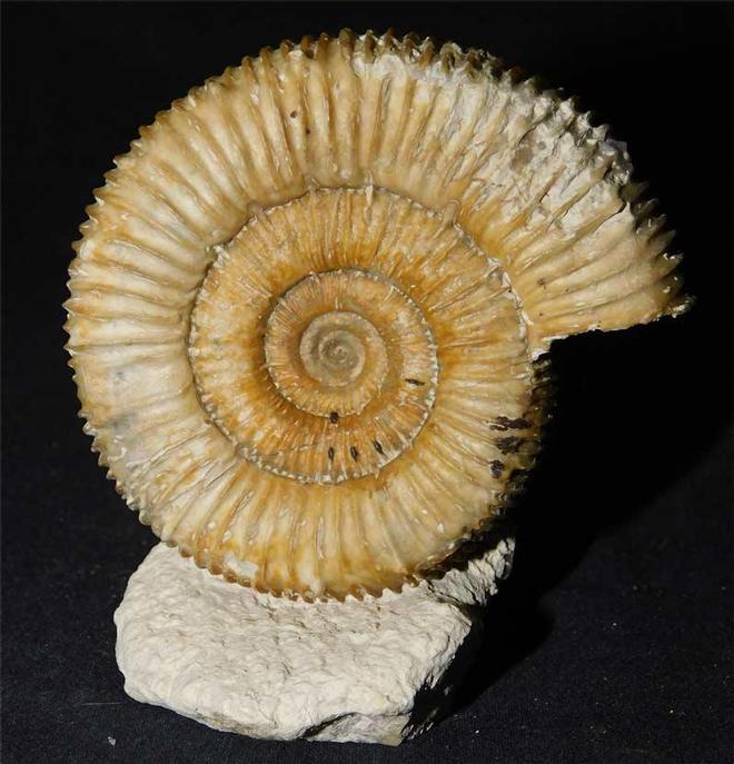 | This upper lias ammonite is extremely scarce for this location. The ammonite has been fully prepared and lies on a small piece of matrix which has a cut base for upright display. There are also some its spines still preserved. It resided in the late GORDON WALKDEN collection. Collecting is now heavily restri8cted at this site. Approximately 180 million years old. |