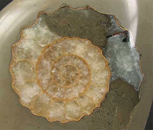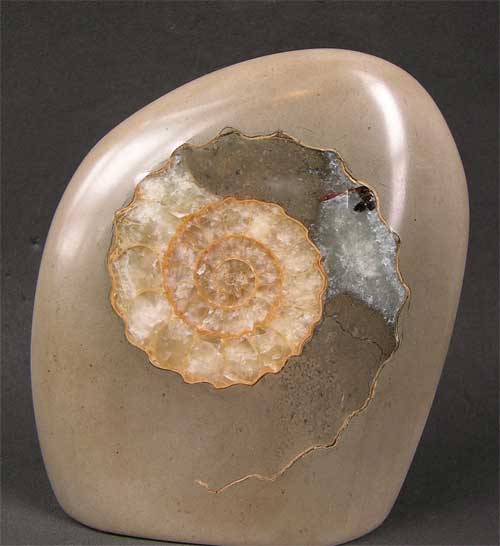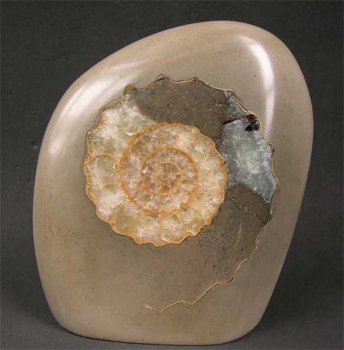 | A stunning display fossil which has been ground and a very high polish applied to reveal all the beautiful internal chambers. This fossil is one of the finest polished 'Green Ammonite' specimens we have seen. All work was carried out by Andy Cowap on this world class ammonite fossil. Approximately 200 million years old. The matrix has a cut base for ease of display - very rare !! |