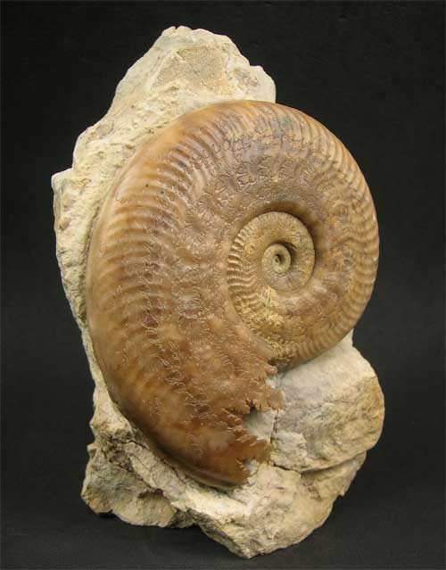 | A stunning yellow and brown calcite ammonite prepared by Andy Cowap. This is a rare type of ammonite shell from a famous fossil locality. When time is spent on preparing these ammonites correctly, they can be absolutely wonderful. The apperture has been abraded to reveal the beautiful suture line. The matrix has a cut base for display purposes. Approximately 180 million years old. |