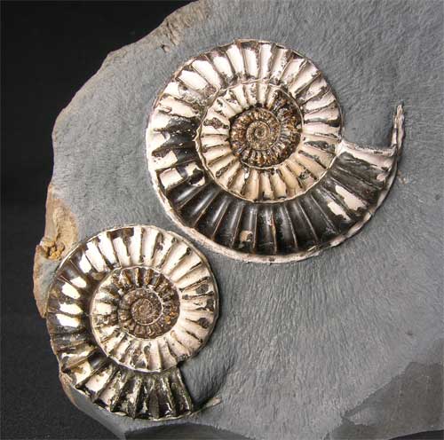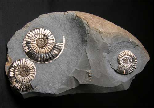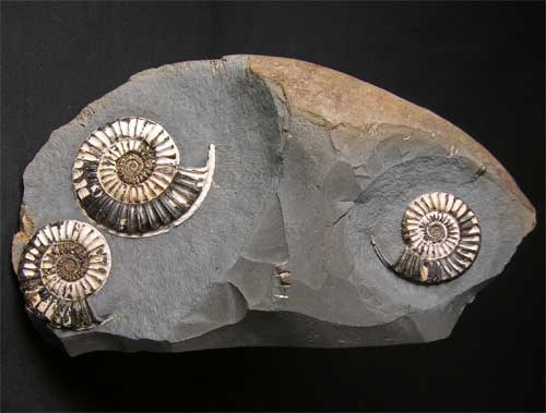| This very aesthetic multi-ammonite fossil was discovered in the late 1970's and has been prepared by Andy Cowap. The three ammonites lie in a half nodule and every one has superb detail. This locality is no longer accessible to the collector which makes this type of ammonite highly sought after by collectors worldwide. The matrix has a cut base for ease of display. Approximately 205 million years old.