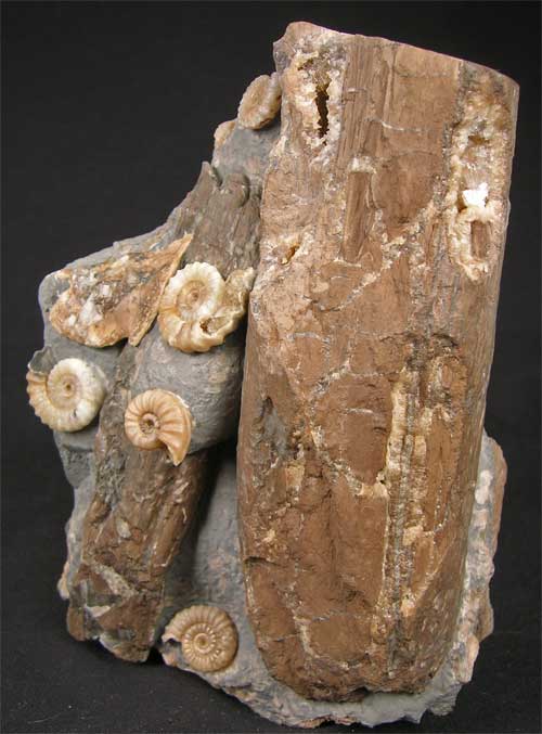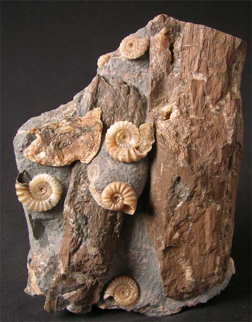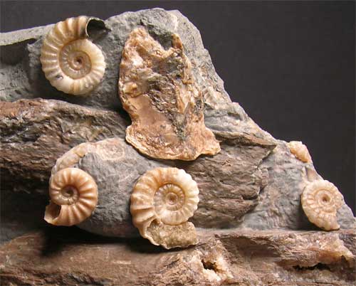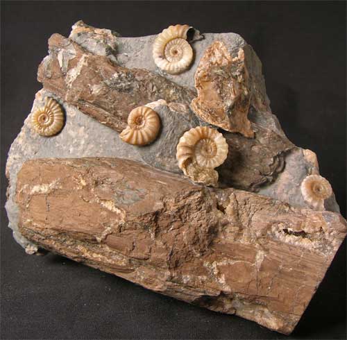 | This superb association of ammonites washed onto fossil branches is very aesthetic indeed. These special fossils from England's Jurassic coast are becoming very rare thesedays. The contrast between the beautiful coloured ammonites and the dark brown wood is magnificent. This particular fossil was unearthed during a severe storm which lashed the coastline some four years ago. Many hours of preparation work has gone into this specimen which was prepared by Andy Cowap. Approximately 200 million years old. |