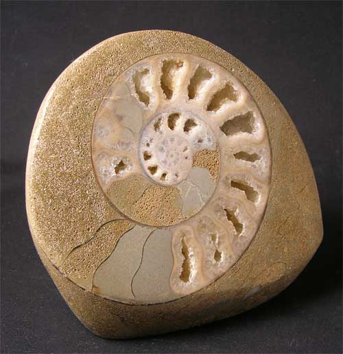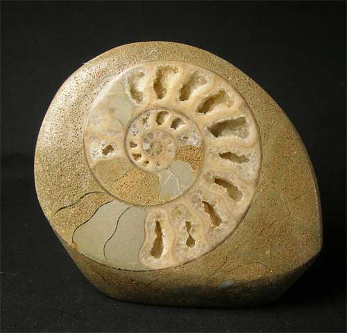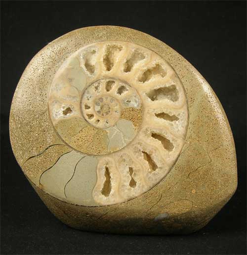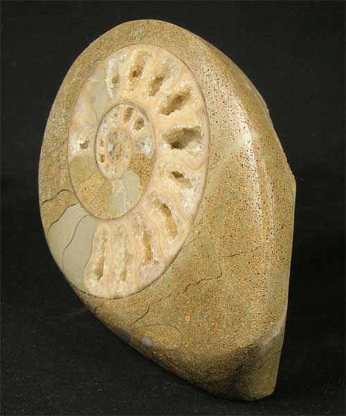 | A superb 'chunky' piece of Oolithic matrix with a solid calcite sonninia ammonite which has been ground gem smooth and then a high polish applied to reveal its beautiful inner chambers. The hollow chambers of the ammonite are packed with hundreds of tiny calcite crystals. A lovely aquisition for either the collector or indeed an interior designer looking to achieve that unique look. Approximately 172 million years old. the matrix has a sturdy level base for display. |