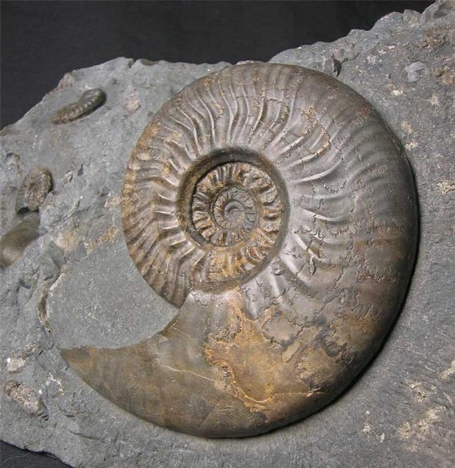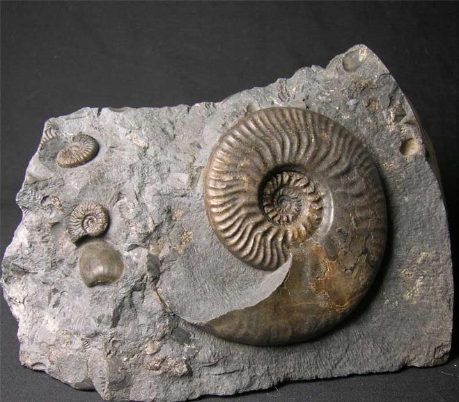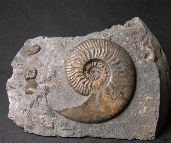 | This superb Ludwigia has been preserved in the lowest part of the Murchisonae Zone and pockets of matrix are very dark in colour but only occasionally contain any ammonites these are called 'Black Blocks'. There are also another two small ammonites (Graphoceras cf castum) and a Bivalve Shell (Pleuromya cf uniformis) on the same matrix next to the large ammonite. These dark coloured Ludwigia's are very rare and this example will make a wonderful display fossil. An anti-slip and scratch pad has been attached to the flat base of the rock to protect furniture or shiny floors to scratching. Approximately 175 million years old. |