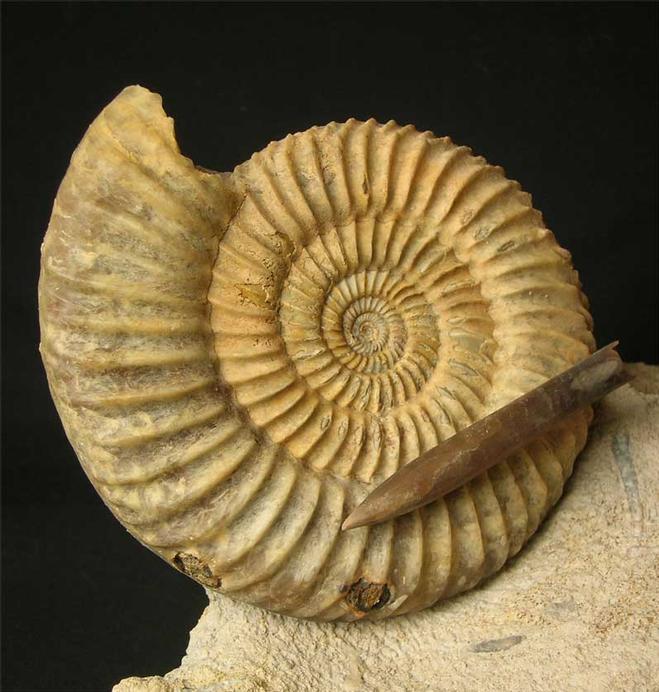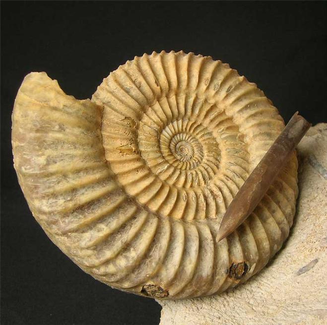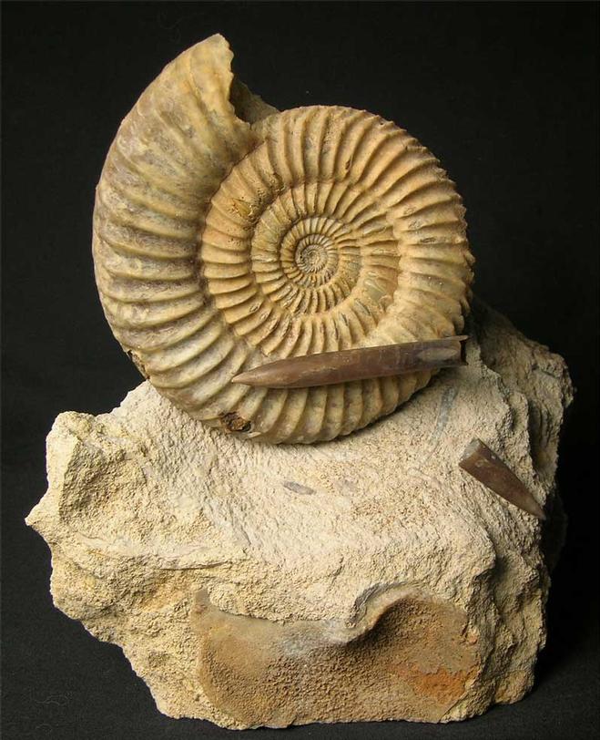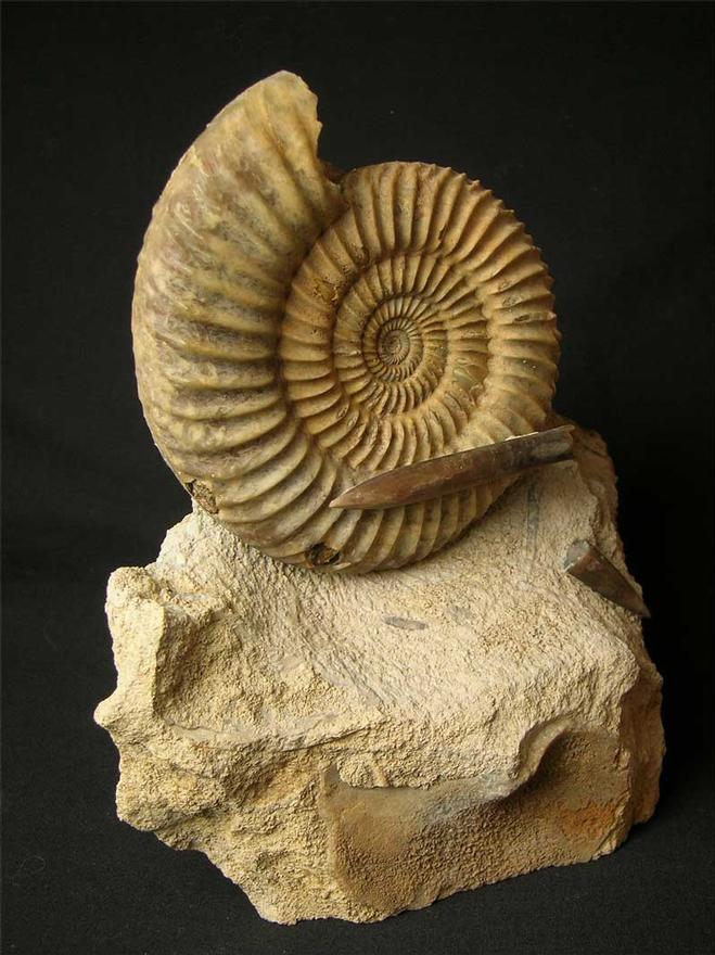 | This very appealing display fossil would suit the collector or an interior designer. Many hours of preparation has gone into this aesthetic fossil. There are also two Belemnite rostrums (Passaloteuthis paxillosus 69 & 29mm)which really add something special to the highly ribbed ammonite. The Belemnite on the ammonite has been left on a thin piece of rock. Freshwater as a locality is no longer accessible to collect fossils hence they are becoming scarse. The matrix has a level base for ease of display. Approximately 167 million years old. |