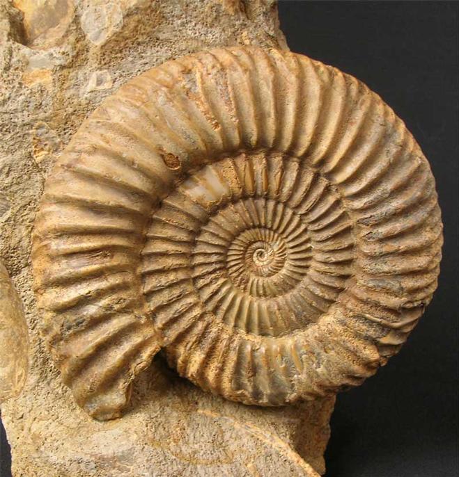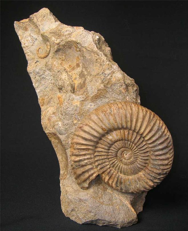 | A very rare and sought after combination, a complete and high quality Spiroceras and Parkinsonia on the same piece of matrix. Heteromorph ammonites are highly prized by collectors worldwide especially ones from the U.K. Many hours of preparation has gone into these two ammonites. Serious collectors will appreciate how rare this fossil is. The matrix has a cut base for ease of display. Approximately 167 million years old. |