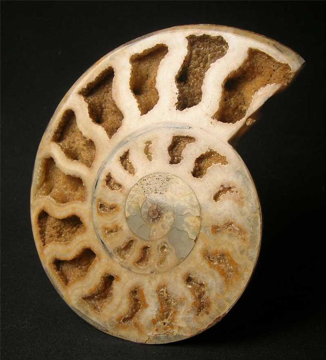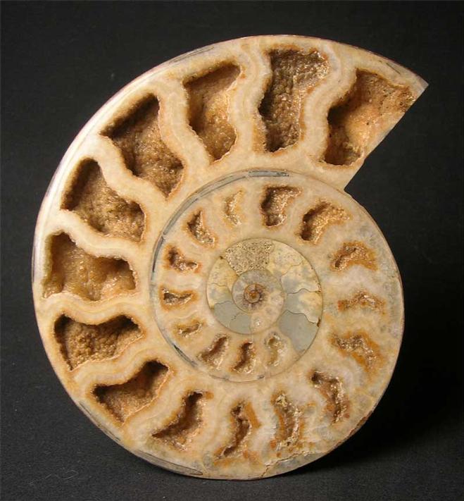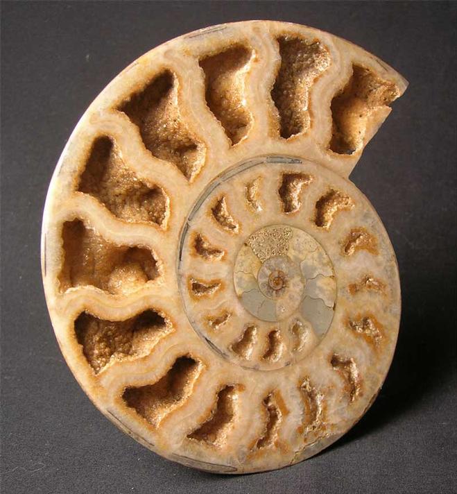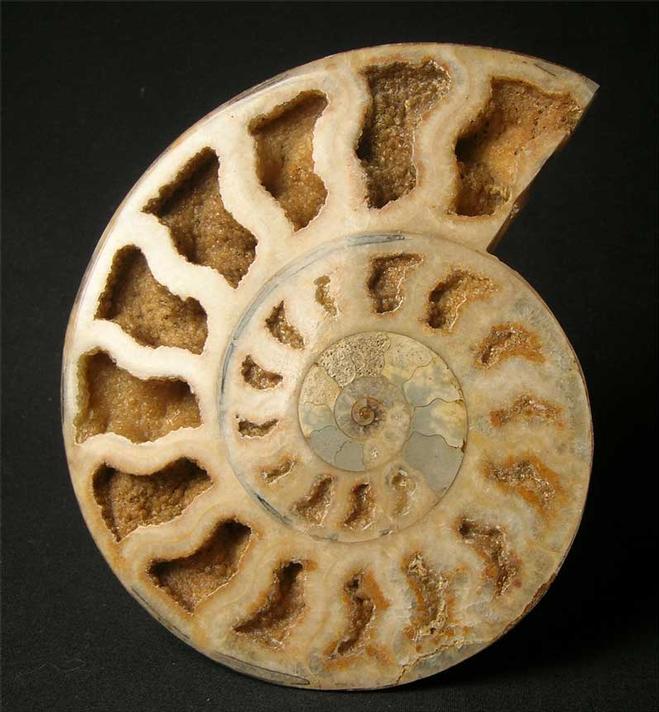| A really top quality cut and polished ammonite half with many open chambers revealing hundreds of tiny calcite crystals within. The ammonite also has a perfect centre. This fossil will make a unique gift idea. Approximately 175 million years old. |