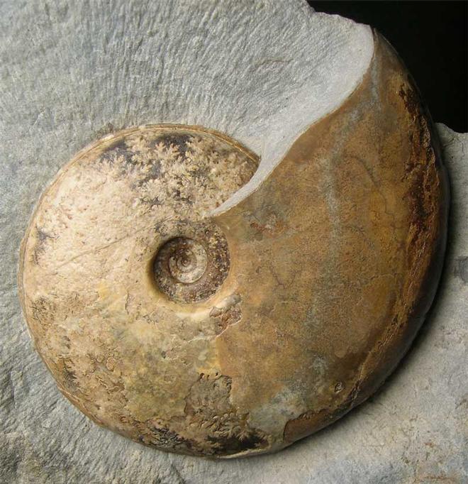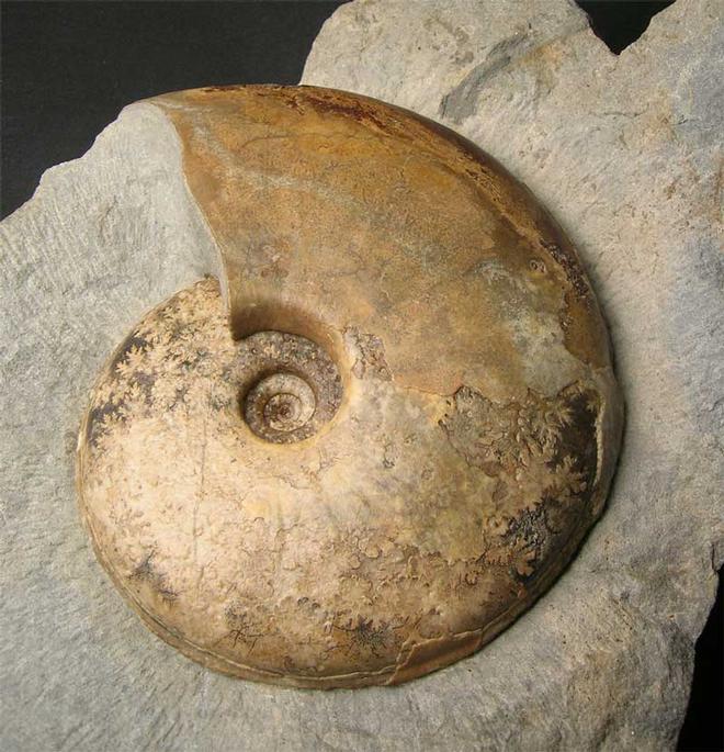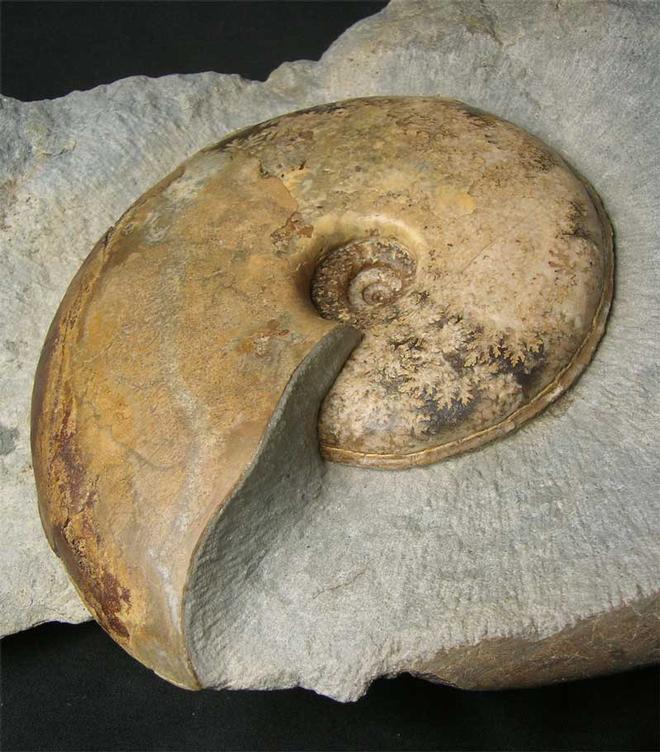 | This ammonite is extremely rare from these shores. We have only found a handful of specimens in over twenty years of collecting from this famous fossil locality. The erosion rate is virtually non existent and the fossiliferous rocks are becoming less and less over a short period of time. The ammonite has an immaculate centre and is preserved in solid calcite. Small patches of shell remain with beautiful detail on the surface and lovely complex sutures under the shell also preserved. Serious collectors of rare UK Oolithic ammonites will appreciate how rare this fossil is. Approximately 175 million years old. This is a highly aesthetic display specimen and has a level base for ease of display.