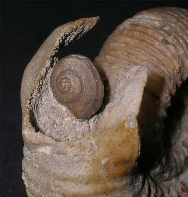 | This very rare example displays one perfect lappet and another partial. The ammonite has been prepared both sides by Andy Cowap and all the matrix removed with stunning effect. A small Gastropod has been washed into the aperture (Obornella granulosa) which really adds to the overall aesthetics. Oolithic ammonites of this rarity and quality rarely come onto the open market. This ammonite was discovered in a temporary exposure in 1989. Approximately 168 milliion years old. A valuable addition for the serious collector of rare ammonites. |