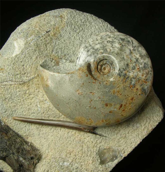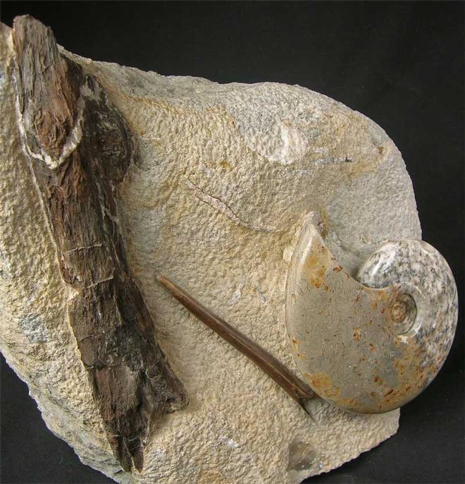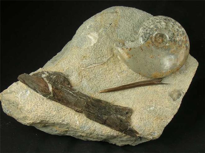 | This superb display fossil exhibits a solid calcified ammonite with beautifully preserved sutures, a piece of hard fossilised branch with knots and washed up against the ammonite a belemnite rostrum. Preserved fossilised three dimensional wood in the Oolite is very rare and highly sought after by collectors. The belemnite rostrum (Belemnopsis cf beyrichi 102mm)is also preserved in solid brown calcite. Wonderful assemblages such as this are not only unique display items for home but sound financial investments for the future, as this particularly locality has been closed and backfilled. The matrix has a cut base for ease of display. Approximately 173 million years old. |