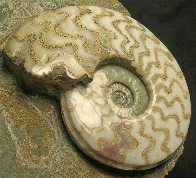| This ammonite has been preserved in shades of white calcite with brown sutures and one amazing pink chamber which is one of the very rarest of colours. Scunthorpe ammonites are one of the world's most desirable fossils. This superb example lies in an aesthetic piece of matrix, and has an original centre, unlike many of the Scunthorpe ammonites you see for sale elsewhere. A great and unique conversation piece for either the serious collector or indeed an investment piece for the future. Approximately 200 million years old. Larger images can be seen in showcase fossils. |