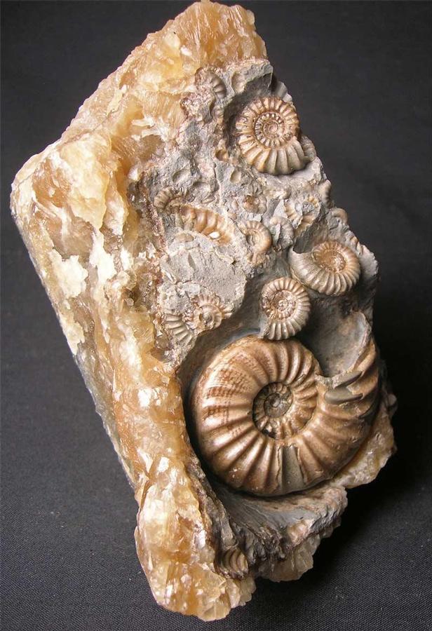 | An incredibly scarse Asteroceras from the Brown Band layer which has an immaculate centre and beautiful colouration throughout. Marston Magna is a world famous iconic Liassic site which has hidden its ancient secrets until now, thanks to a temporary exposure. Alongside the Asteroceras are three Promicroceras Marstonense, also preserved in solid calcite. This is one of only a few Asteroceras discovered within this Brown Layer. The surrounding matrix has a light yellow calcite edge which really adds to the overall aesthetics of the specimen. This extremely rare association from Marston Magna has taken many hours of prepare and is one for the connoisseur of fine fossils. |