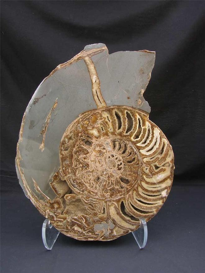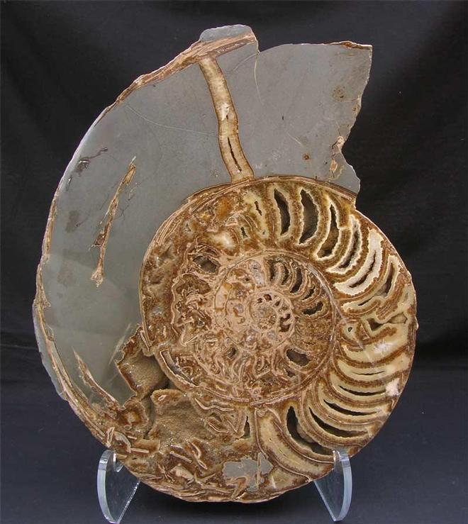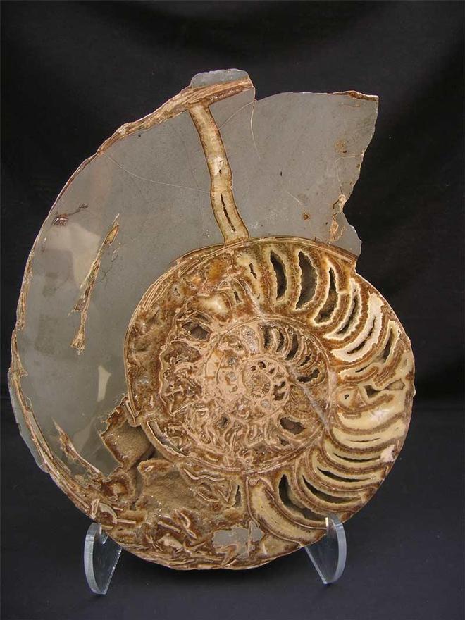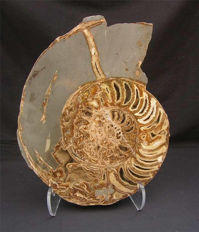 | This specimen has been part of my personal collection for over 10 years and originates from the world famous collection of "Barney Hansford" who was a prolific collector in the 1950's. This specimen has been re-polished to reveal the beautiful calcite chambers within.This is a very large and imposing display specimen and is an absolute classic from this world heritage site. The specimen also comes with a display stand. This would look fantastic in any interior or office space and is approximately 200 million years old. Larger pictures can be viewed in "Showcase Fossils". |