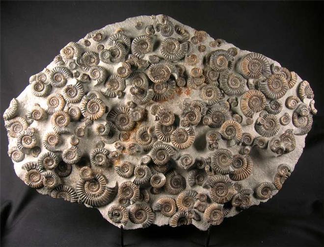 | This spectacular multi-ammonite fossil is one of the largest Arnioceras nodules every discovered on the Yorkshire coast. Every ammonite has been preserved in different shades of brown calcite. The fossil itself has taken weeks to prepare in Yorkshire around 5 years ago and was discovered in 1978 as a huge storm washed the nodule up onto the shore. To find another Arnioceras nodule this size in the future, is highly unlikely from this stretch of coastline. Our research has confirmed that the UK museums cannot match this specimen for size. The fossil comes with a display stand and with the correct lighting focussed on the ammonites, this wonderful mass mortality will come to light within the nodule. A one off piece for the serious collector or interior designer looking for that special fossil for maximum impact for their clients. This magnificent fossil is approximately 206 million years old. Please note that there are larger images in "Show Case Fossils" of this fine specimen and more images are available on request. |