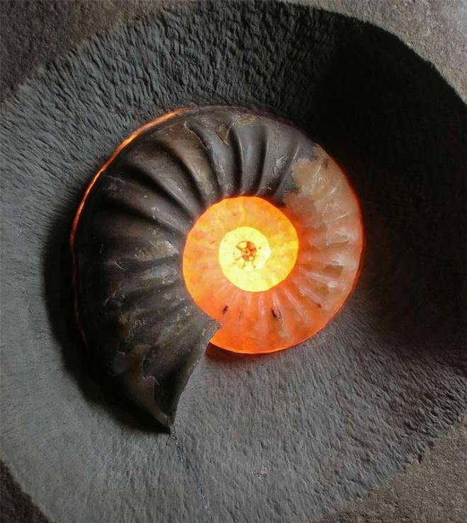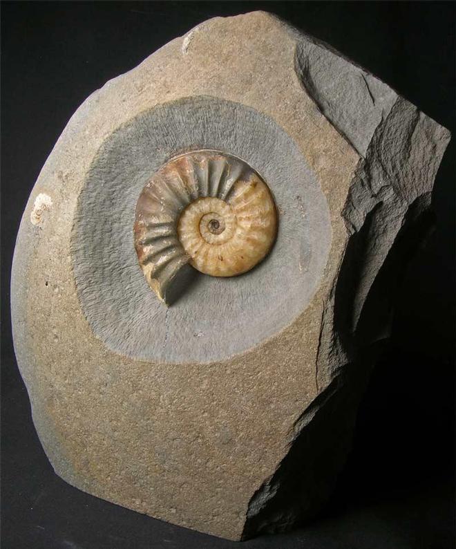 | A regular well prepared Asteroceras which has taken many hours of preparation. When the stone was discovered, the ammonite was visible on the reverse side and prepared from the other, so the whole ammonite is visible on either side. As in the main picture, when a light is present, the ammonite glows yellow through the calcite with stunning effect. A unique fossil for either the home or office space. The base of the nodule has been cut flat for upright display and is approximately 200 million years old. |