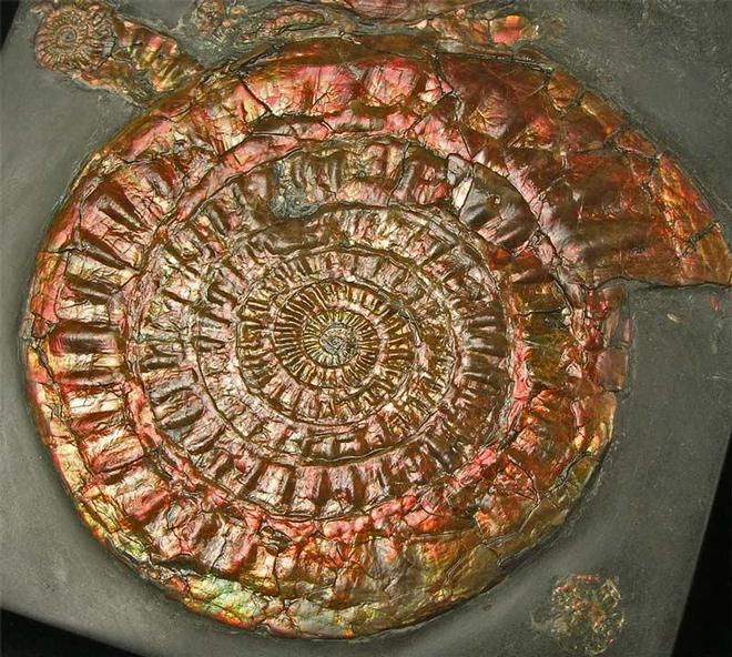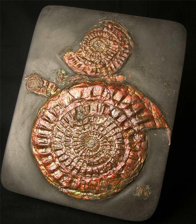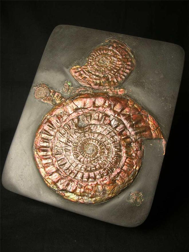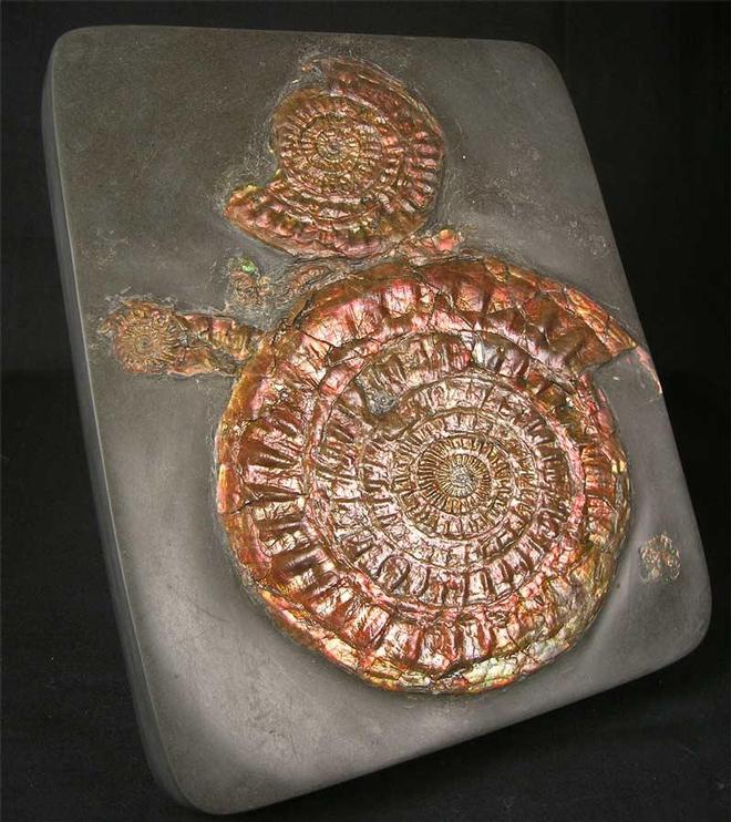 | This fantastic example was collected in 1971 and has remained in the same collection ever since. Collecting these ammonites from this stretch of coast is not permitted thesedays, and so these natural irridescent ammonites are becoming real collectors pieces. The colours exhibited in these specimens are red, orange, green, yellow and purple. Both the shale and ammonites have been fully prepared and the main ammonite has an immaculate centre. Becoming very scarse to obtain. Approximately 200 million years old. |