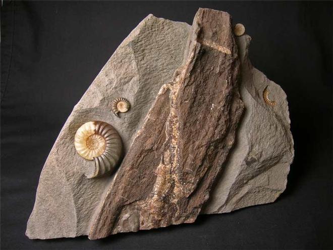 | An absolute classic piece with three calcite ammonites and part of a fossil branch preserved (200mm). The branch belongs to the ancient Monkey Puzzle Tree which covered vast areas around 200 million years ago. Alongside the wood lies a complete Asteroceras and a Promicroceras planicosta. Pieces of wood with ammonites are becoming incredibly scarse from this world famous locality and the woodstone nodules are unique to Black Ven. The matrix has a level base for upright display. Prepared by Andy Cowap. Approximately 200 million years old. |