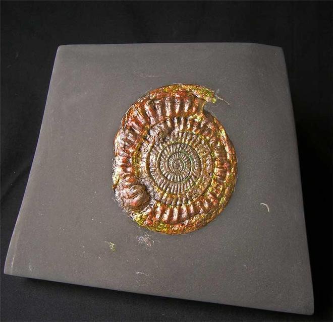 | This natural irridescent ammonite was discovered in 1973, and the ammonite and the matrix has been re-prepared to this extremely high quality. When turned to the light the ammonites natural colours include orange, yellow, reds and green with a hint of blue and purple. The ammonite's centre is immaculate. The specimen lies in an aesthetic piece of hard shale which has a level base for upright display. These superb ammonites are becoming increasingly difficult to obtain thesedays as tight restrictions have been put on the site. Approximately 208 million years old. |