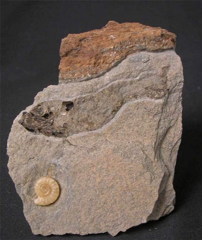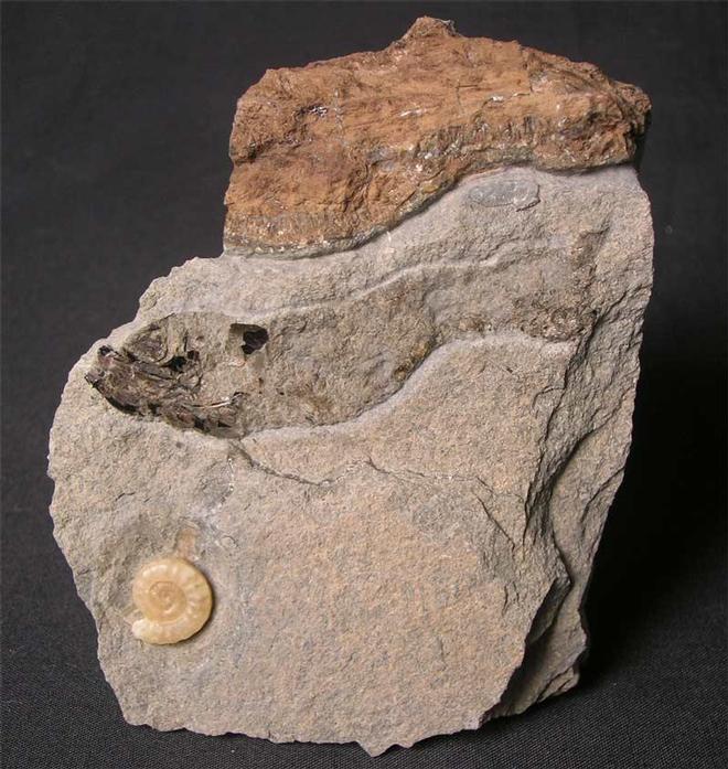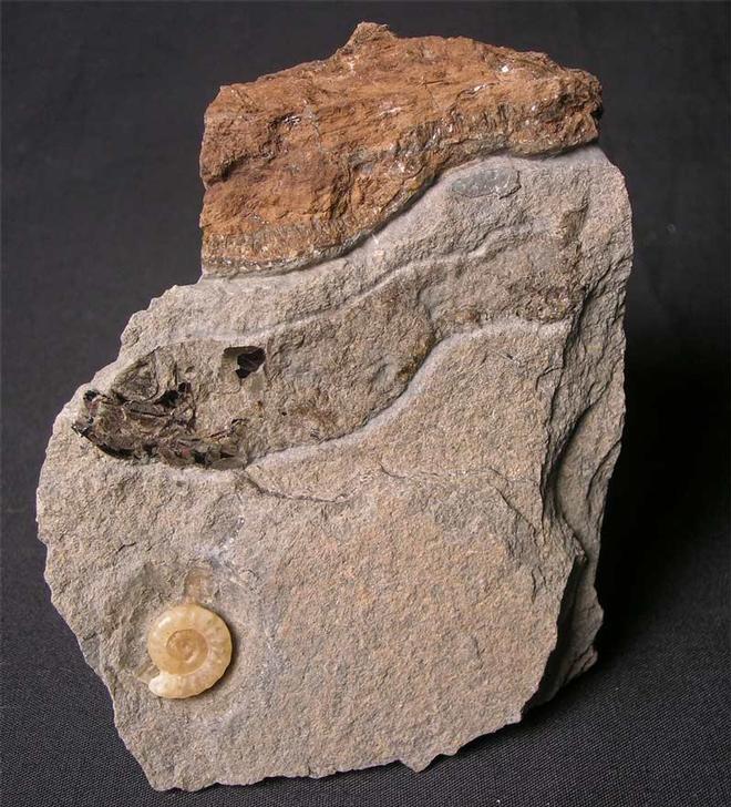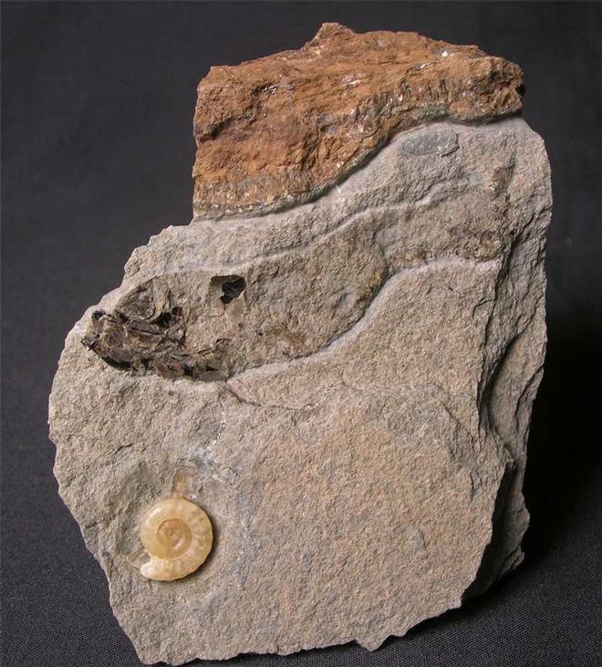 | A rare combination indeed from this world famous fossil locality. The fish (Proleptolepis furcata.NYBELIN) has a wonderfully preserved head but the rest of the body is faint but still there, minus the end of its tail. The ammonite has been preserved in solid pale yellow calcite and the wood fragment is from the "Monkey Puzzle" tree. An extremely rare combination to get these together on one piece of rock. Approximately 200 million years old. |