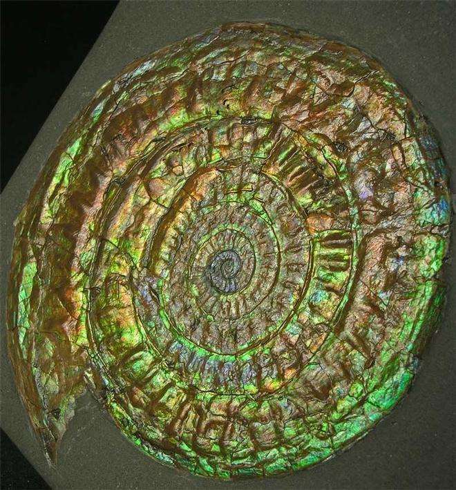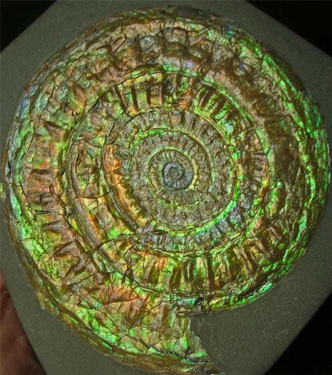 | This classic ammonite exhibits stunning natural irridescent colours when turned to the light which include, greens purple, blue, orange and red. The ammonite and matrix has been fully prepared by Andy Cowap, the bottom of the hard shale has a flat base for display purposes. Caloceras from this locality are becoming increasingly difficult to obtain thesedays due to heavy retrictions on collecting, this wonderful ammonite was collected in 1972. A real collectors piece which is totally unique. Approximately 208 million years old. |