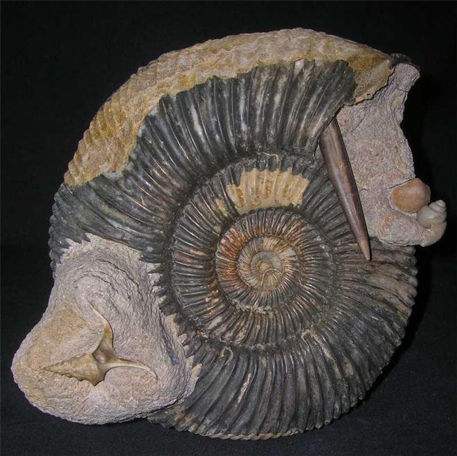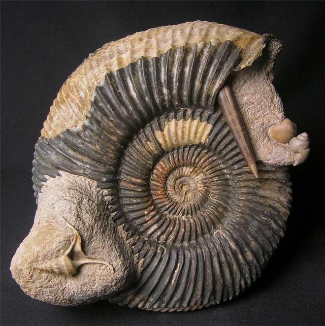 | This Parkinsonia retains most of its shell with the odd serpulid wormtube attached. The extreme centre however, has not been preserved but some of its mouth border remains. The main feature is the extremely rare gastropod (Apporhais sp). Usually if these gastropods are discovered they are only partials whereas this one is totally complete. Collectors of rare UK fossil gastropods will appreciate this stunning specimen. Also washed near the ammonite's aperture, is a belemnite guard (Passaloteuthis appicurvata), another gastropod (Natica subelegans) and a bivalve shell (Ornithella cf laganalis). This specimen was discovered in 2006 in a large cliff fall. Approximately 167 million years old. |