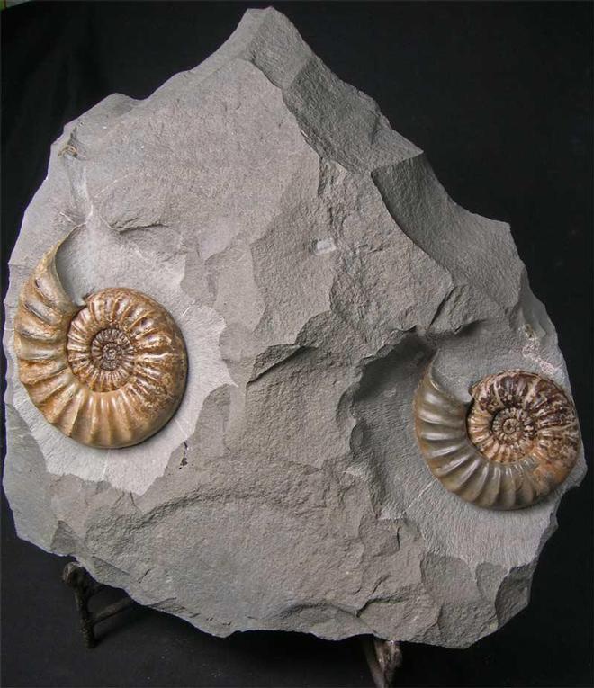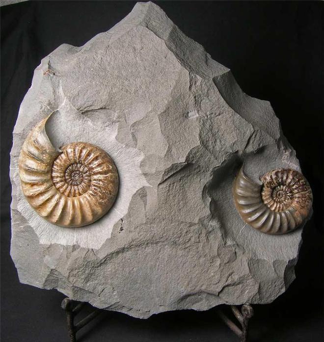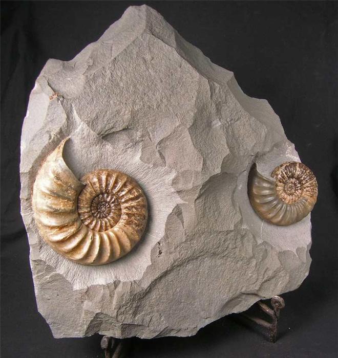 | This highly aesthetic display fossil exhibits two totally complete ammonites which have been preserved in different shades of brown calcite and hae immaculate centres. This flatstone nodule was found at the famous "Dead Mans Tree" area of Black Ven, the very best preserved fossils are found here. This specimen was discovered in 2009 and many hours have gone into its preparation. The fossil comes with a bespoke and sturdy wrought iron display stand. A fantastic and unique display piece for the home or office space which is approximately 200 million years old. |