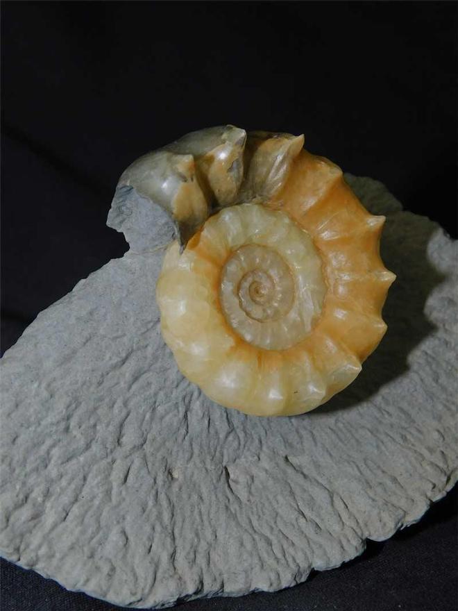 | A beautiful specimen with most of its spines preserved. The ammonite has been preserved in pale yellow calcite and has an immaculate centre. It lies on a small piece of matrix which makes the whole piece highly aesthetic. These spiny Xipheroceras are becoming difficult to obtain from this world famous locality and take many hours of preparation. A lovely collectors fossil which is approximately 200 million years old. |