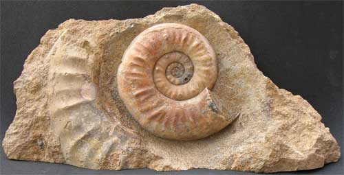 | A classic and rare Sonninia from a locality which is no longer accessible to the collector. This fossil was prepared by Andy Cowap and would make not only a superb display fossil but a key specimen for any serious collector of rare ammonites. The matrix has a cut base for ease of display. |
