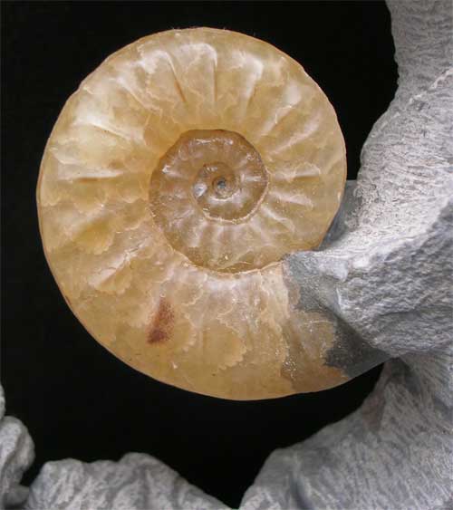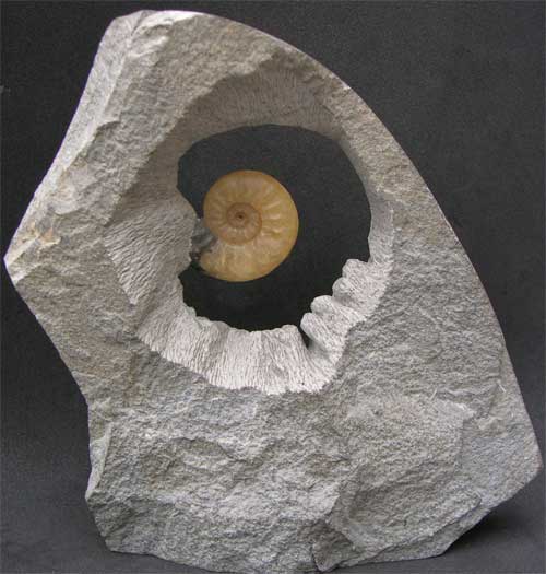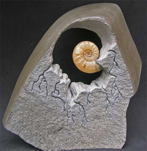 | A wonderful and unique concept of preparation. When light either natural sunlight or artificial is present at the back of the fossil, the aim is for it to resemble a rising sun above sculptured mountains within the matrix. The ammonite shell is a lovely pale yellow calcite. Lightening forks have been engraved coming down from the mountains to give the overall picture a more dramatic effect. Also the outer edge has been ground smooth and a high polish applied. A truly superb aquisition for the interior designer looking to achieve that extra edge. All preparation work and design on this specimen was carried out by Andy Cowap. |