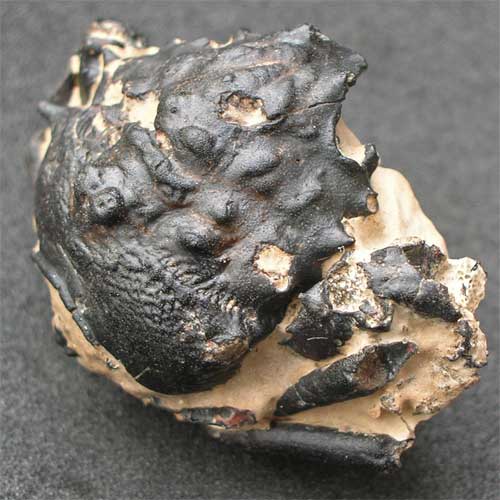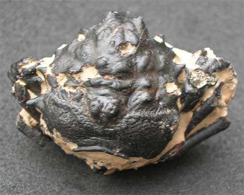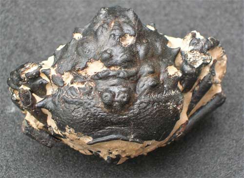 | A stunning specimen of this uncommon little crab from a world famous fossil locality. This particular specimen was collected over forty years ago. This crab is approximately 50-54 million years old and is museum quality. The crab is preserved in three dimensions within a nodule. |