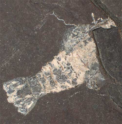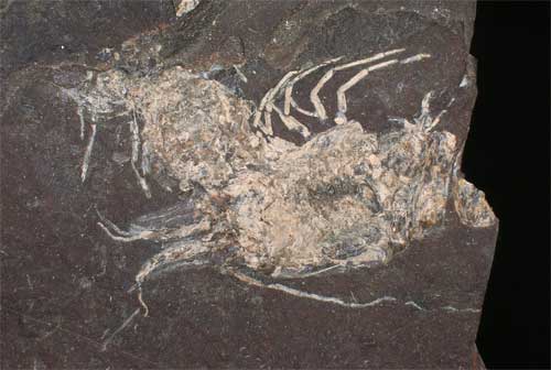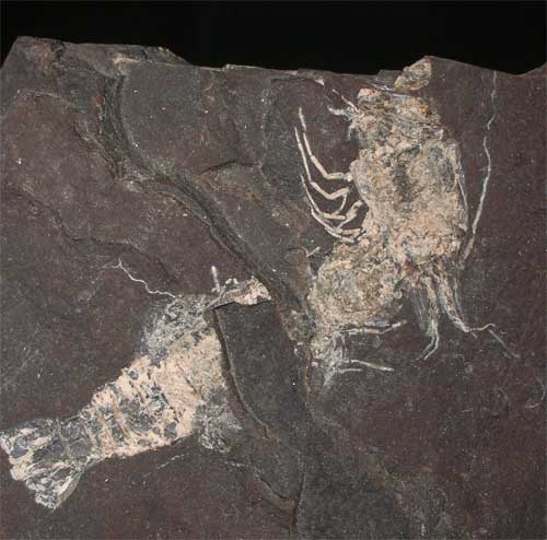 | The detail on these shrimps is incredible bearing in mind that these animals died approximately 340 million years ago. This is a classic example of these oil shale shrimps, this specimen coming from an old collection. A wonderful addition to any collection. |