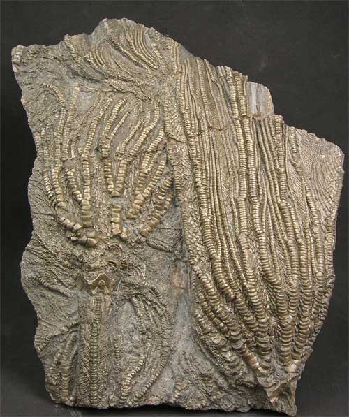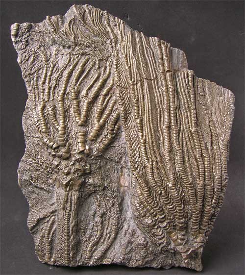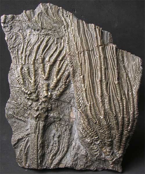 | Specimens of this quality are seldom found nowadays and this is a stunning multiple pyritized example. The detail and the depth of the crinoid is of exceptionally high quality. The specimen has a slight repair as is the case with most crinoid slabs, this however does not detract from the specimen. A beautiful piece of underwater life captured in time. The specimen is from an old collection and would enhance any collection - a wonderful addition ! |