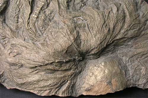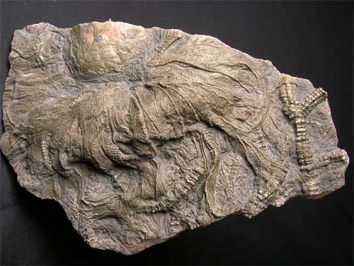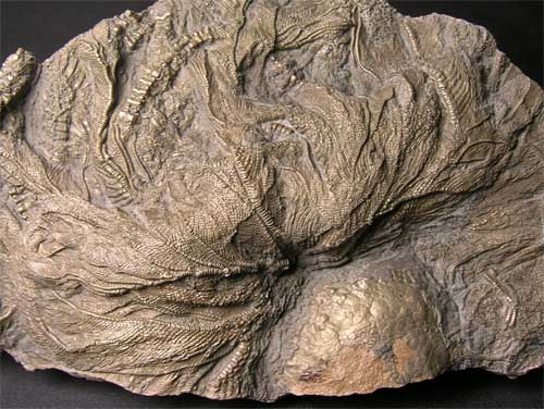 | A stunning piece of highly pyritized Pentacrinites from the area which Mary Anning used to patrol some 200 years ago. The crinoid itself has its mouth preserved, this very rare feature only happens when the leaves are swept back by the water currents and then rapidly buried. The depth of the crinoid and detail on the leaf and stems is magnificent. Only very rarely do pieces of such quality reach the open market for sale. The fossil itself has had many hours of preparation spent on it. It was discovered after a severe storm hit the south coast during the winter of 1995 bringing this superp fossil down the cliffs in a mudslide. Approximately 200 million years old. |