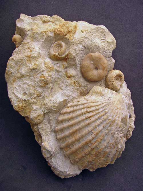 | A really nice multi-fossil display piece, it contains one Bivalve (Pecten sp), one Sea-Urchin (Pygurus Ringens), 1 Juvenile Nautilus and two Ammonites (Garantiana sp and prorsisphinctes). Prepared by Andy Cowap these display pieces are highly sought after. |