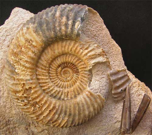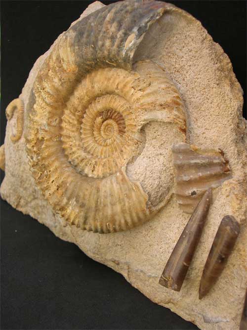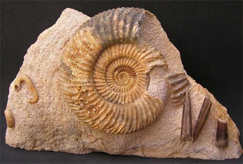 | An absolutely fantastic display fossil from a locality which is highly sought after by collectors. The specimen contains (one Parkinsonia dorsetensis: large) (one Spiroceras anulatum, rare) two Belemnite rostrums (Passaloteuthis sp) and one juvenile (Parkinsonia sp). Fossils of this calibre and quality take many hours of preparation. Prepared by Andy Cowap. This specimen is apprixmately 167 million years old. |