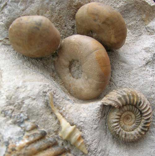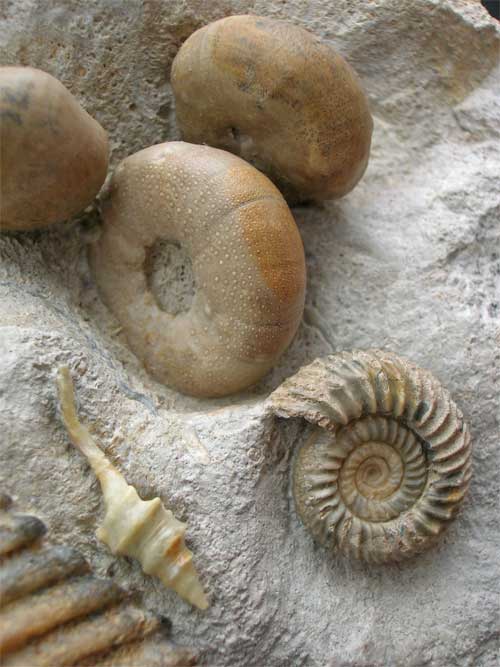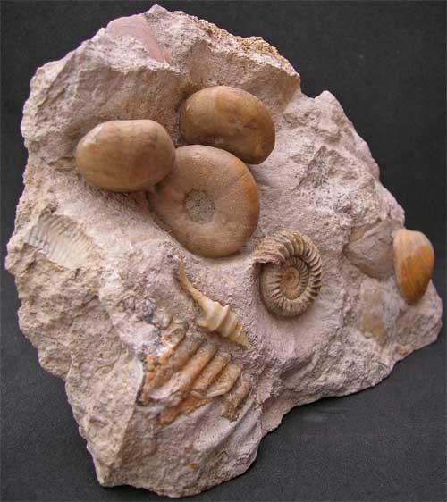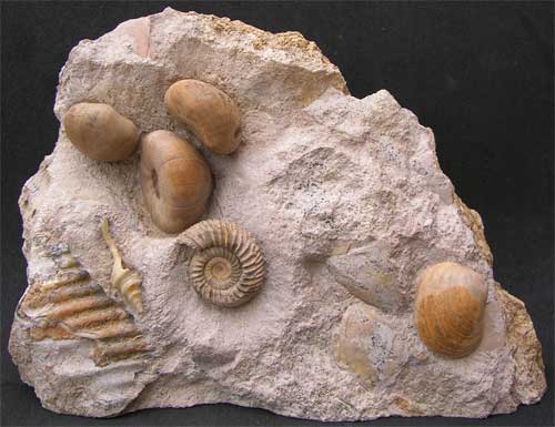 | A beautifully prepared multi fossil death assemblage which consists of three echinoids (two Pygurus ringens & one Stomechinus bigranularis, centre Echinoid), one Gastropod (Apporhais sp), one Ammonite (Parkinsonia rarecostata, juvenile shell), and one Bivalve (Gresslya sp). Assemblages such as this one with the variety of fauna shown, make superb display fossils and each one unique. These multi-foissils are uncommon. |