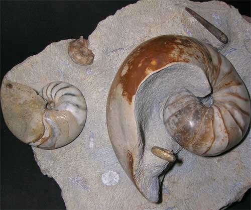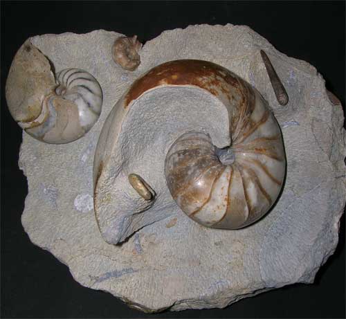 | A very rare multi-fossil assemblage from a locality which is no longer accessible to collect fossils. Double Nautilus display fossils are very rare especially quality specimens such as this one. The block consists of:- (two nautilus, Cenoceras aff. semistriatum (Size 110mm) and Cenoceras sp (Size 70mm)Belemnite Belemnopsis cf beyrichi, two ammonites, Sonninia (euhoploceras) acanthodes (Spines)and Dorsetensia cf romani. Fossils of this calibre from the UK are few and far between. This item comes with a chrome display stand. Many hours have gone into this fossil. Prepared by Andy Cowap. |