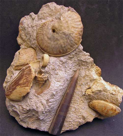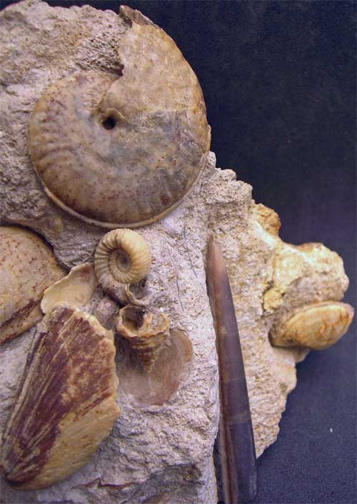 | A beautifl display fossil prepared by Andy Cowap. The specimen contains a Belemnite (Passaloteuthis sp), two Ammonites (Strigoceras & Garantiana), two Bivalves (Gervillella sp and Pleuromya uniformis) and also a Gastropod sp. Blocks of this quality rarely come up for sale on the open market. Many hours of preparation goes into fossil associations of this quality. |