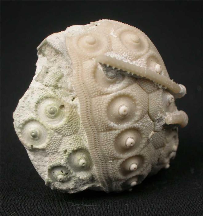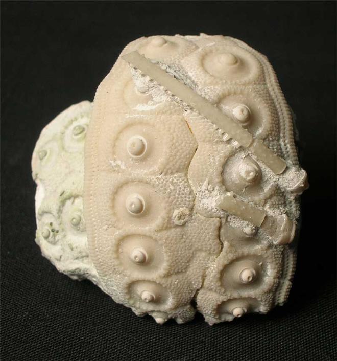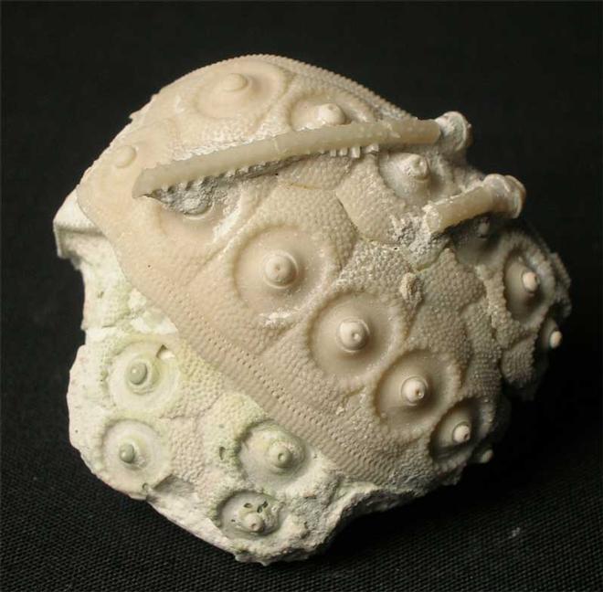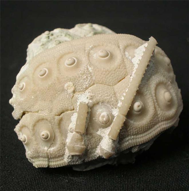 | This is a beautiful and very highly collectable partial example of this Cretaceous echinoid. The detail throughout the specimen is exceptional which has been beautifully prepared using air abrasive techniques. Also attached to the test are two of the echinoid's spines. A lovely and rare example. |